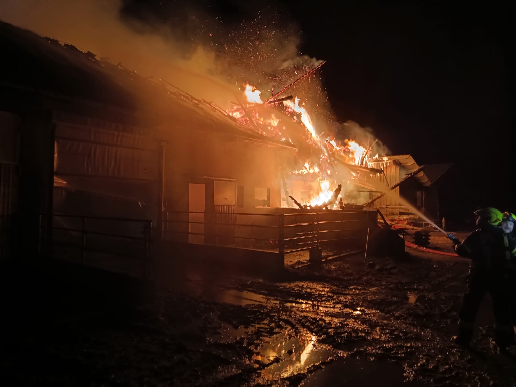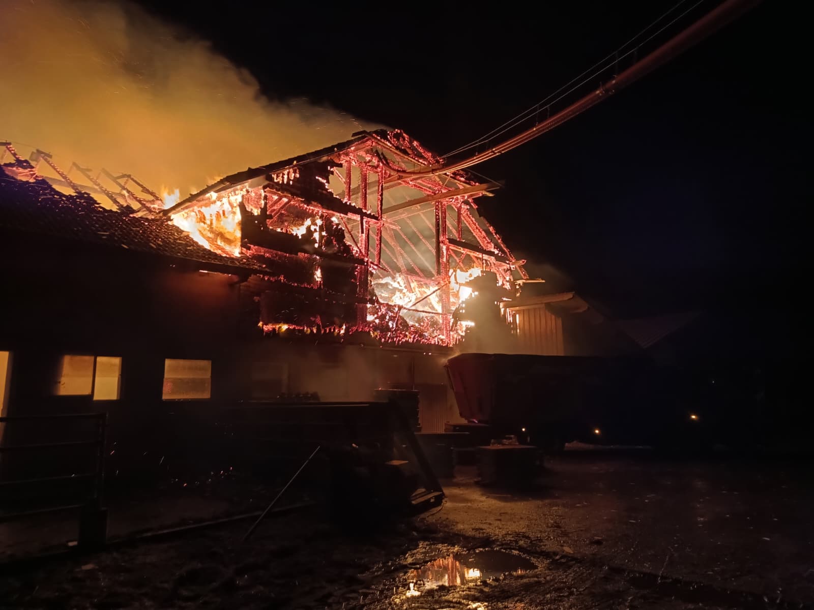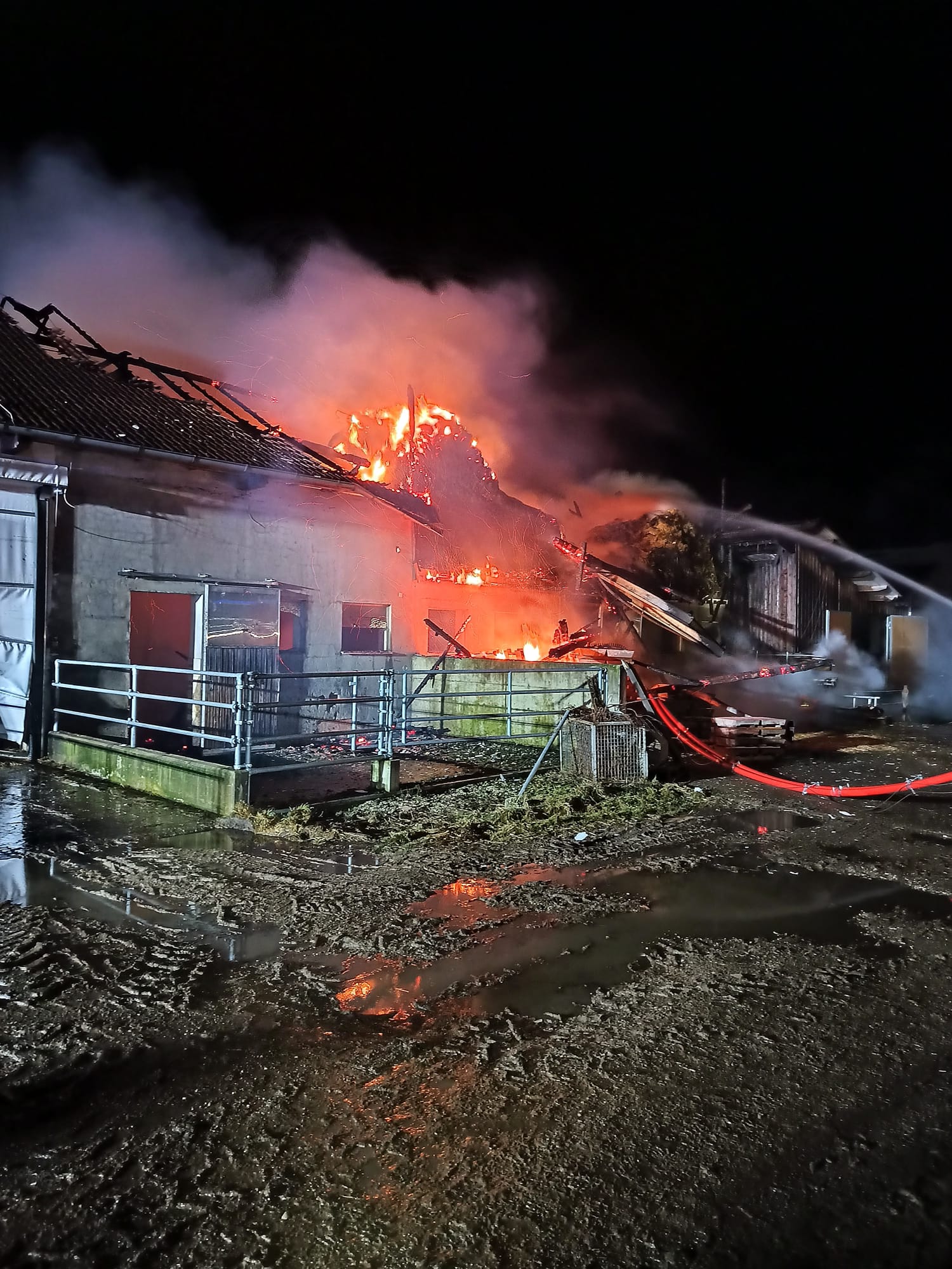 Gegen 01:00 Uhr morgens wurden die ersten Feuerwehren alarmiert, nachdem die Besitzer durch verdächtige Geräusche auf das Feuer aufmerksam geworden waren. Beim Eintreffen der ersten Einheiten stand der Stall bereits in Vollbrand. Aufgrund der starken Windböen und der exponierten Alleinlage des Hofes wurde die Alarmstufe auf Stufe 3 erhöht.