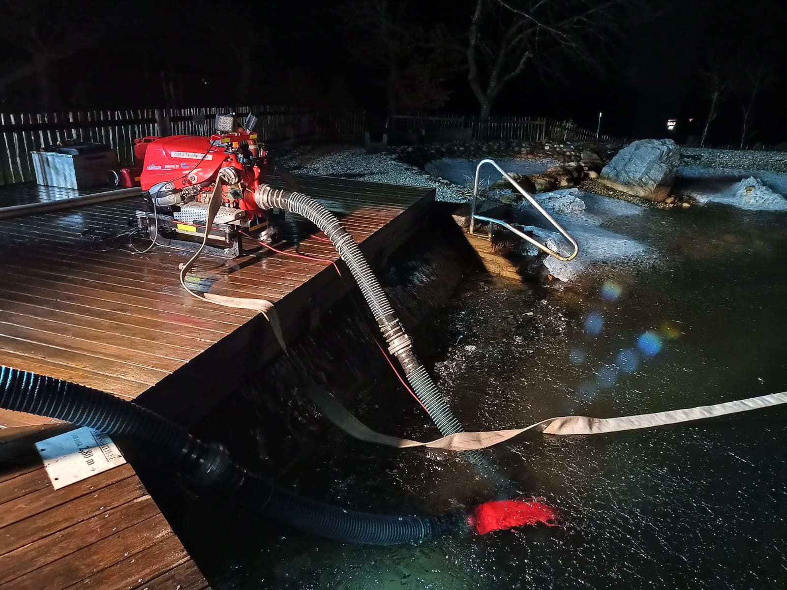 • Löschwasserversorgung: Die abgelegene Lage forderte massiven Aufwand. Es mussten kilometerlange Relaisleitungen (u.a. aus Odelboding und von einem privaten Teich) gelegt werden, um das Brandobjekt ausreichend mit Wasser zu versorgen.