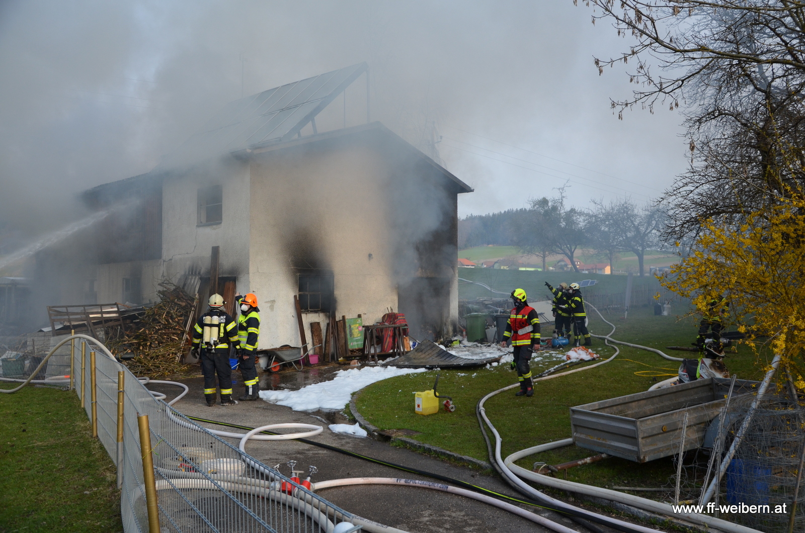 Auf dem Dachboden des Gebäudes konnten ein Hackschnitzellager, ein Heustock und andere leicht entzündliche Materialien lokalisiert werden. Teile des Daches und der Holzfassade mussten mit Hilfe eines Teleskopladers nach und nach abgetragen werden um besser an den Brandherd gelangen zu können.